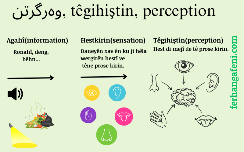Maneya hestkirin û têgihiştin cuda ye. Hestkirin bi rîya organên hestê çêdibe. Ev organ sînyal dişînin mejîyê. Sînyal bi rîya mejîyê tê mane kirin. Têgihiştin, pêvajoya mane kirina van sînyala ye.