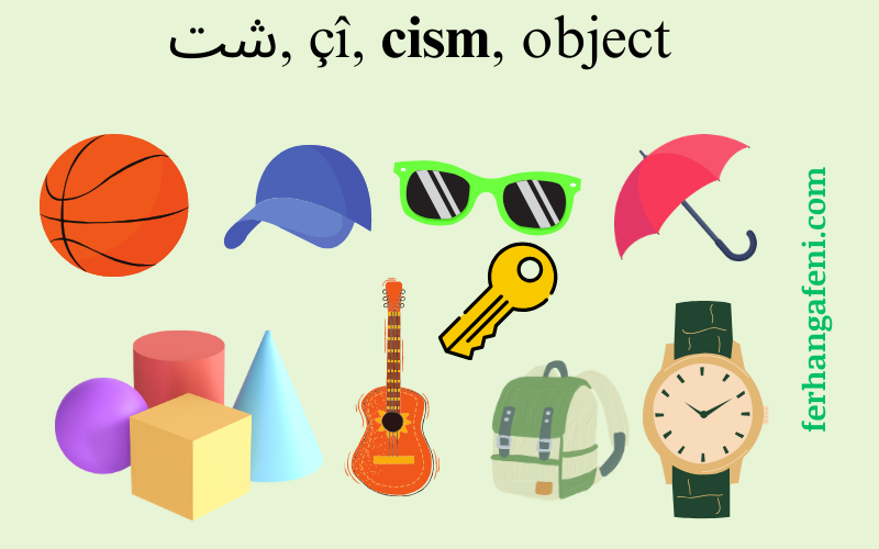 ‘Made’, ‘cism’ û ‘tişt’ têgihên xwedî maneyên cihê ne. ‘Made’, materyela ku tiştek jê hatî çêkirin e, mîna av, zêr, an hêsin. Kursî, mese, an kitêb ‘cism’ in. Kursî cismek e ji ber ku xwedan form û fonksiyonek taybetî ye. ‘Tişt’ têgehek berfireh e ji bo her tiştî, madî an xeyalî. Mînakî, evîn tiştek di wateya razber de ye, lê kevir tiştek fîzîkî ye. Parçeyek dar (madeyek) dikare bibe peykerek (cismek) bi şekl, lê gel ji bo peyker di zimanê rojanê de dikare bêje ‘tişt’.